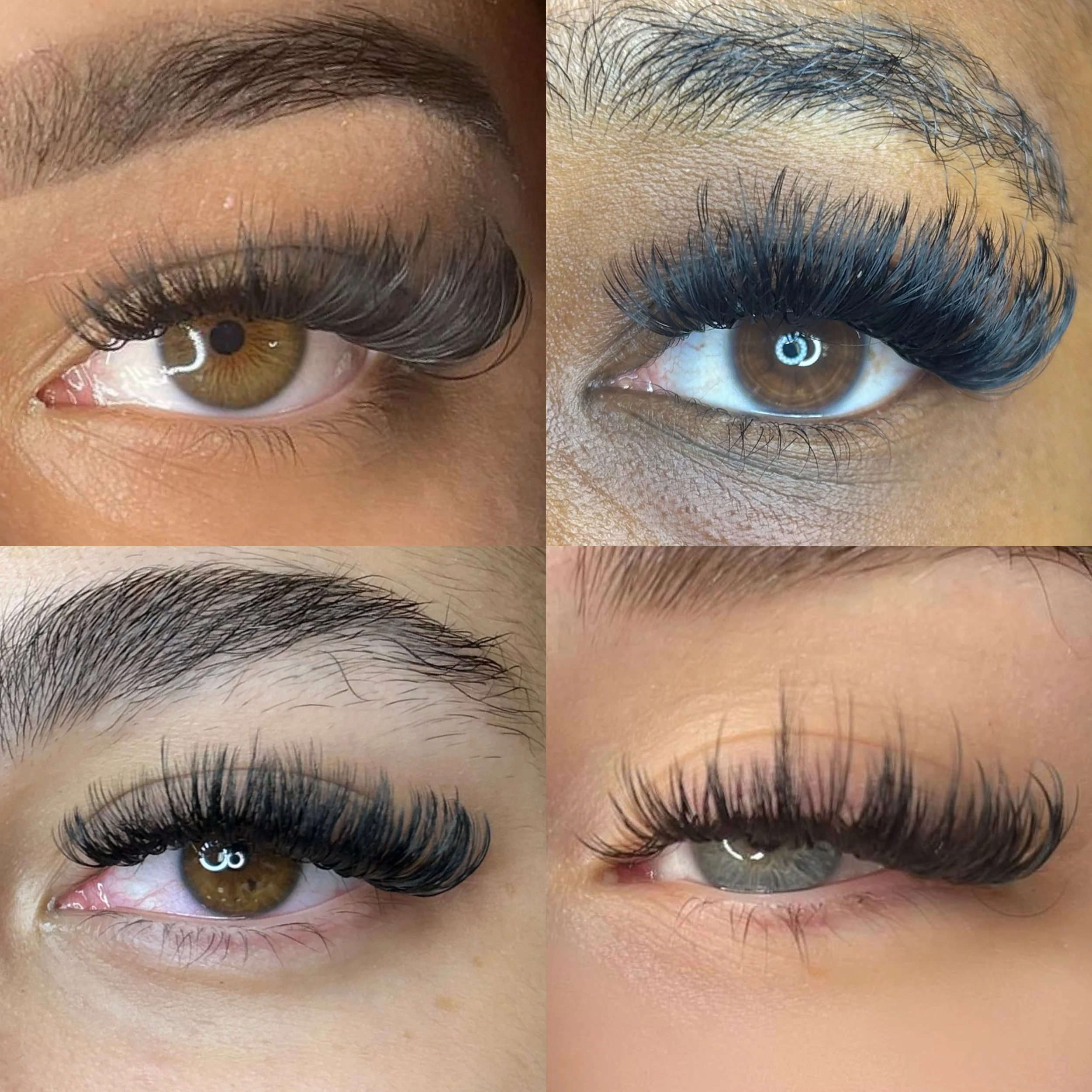 A combination of classic lashes and volume fans to achieve a soft, fluffy lash line.